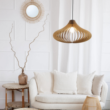 Suspension moderne en bois au design scandinave. Son abat-jour géométrique diffuse une lumière douce et chaleureuse, idéale pour la salle à manger, le salon ou la chambre. Allie élégance naturelle et style contemporain.